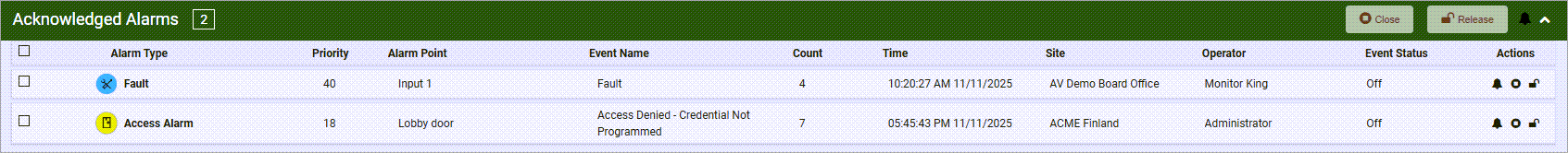 Release- Select one or more alarms to release them back to the new alarms list. You can change the alarm priority before releasing.