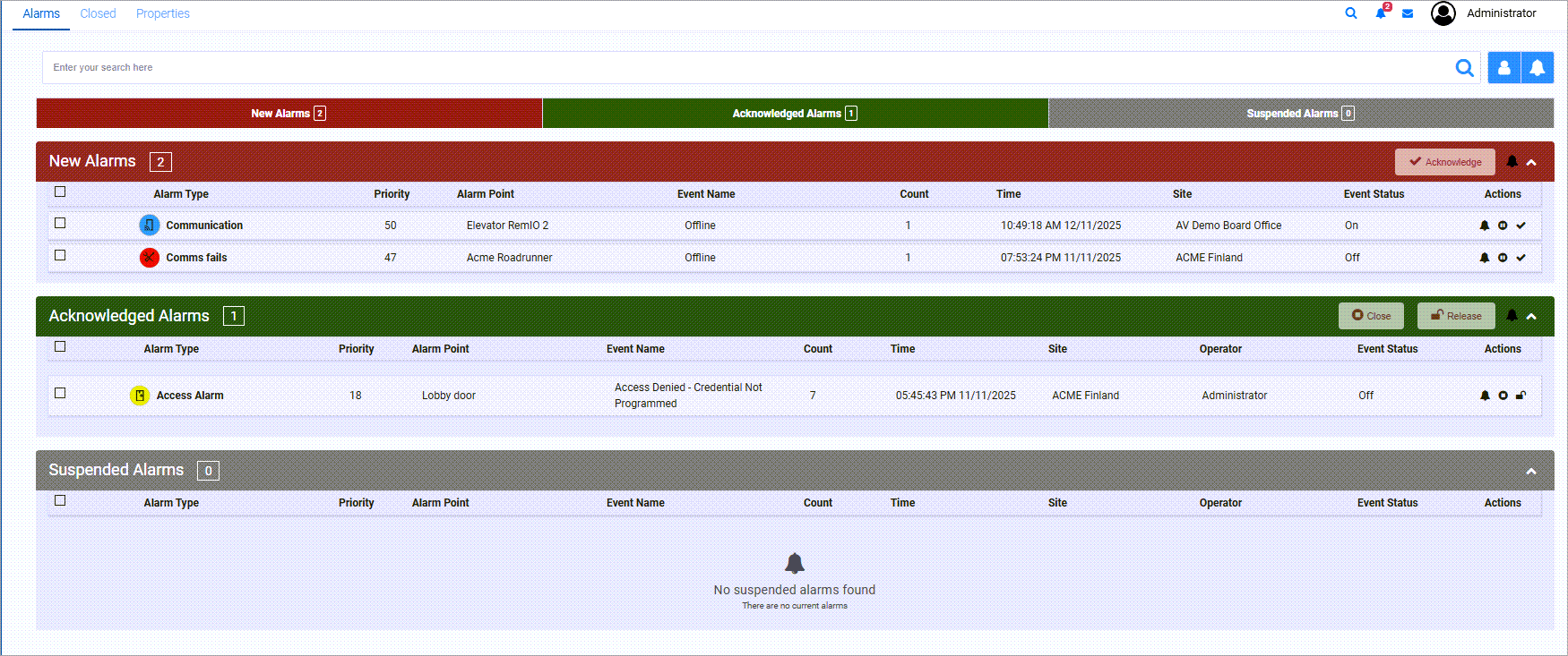 The Alarms page enables you to monitor and manage alarms. The Alarms page provides a unified view of all active alarms, clearly categorized by their states, New, Acknowledged, and Suspended.