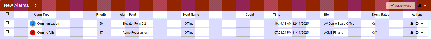 Use the header actions to manage alarms. Select the bell icon to mute audio notifications for all current and future New Alarms, including re-notification alerts. Select one more alarms using the check boxes and click Acknowledge on the list header to move these alarms to the Acknowledge Alarms list.
