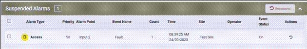 To unsuspend alarms and send them back to the New Alarms list, select one or more alarms using the check boxes and click Unsuspend.