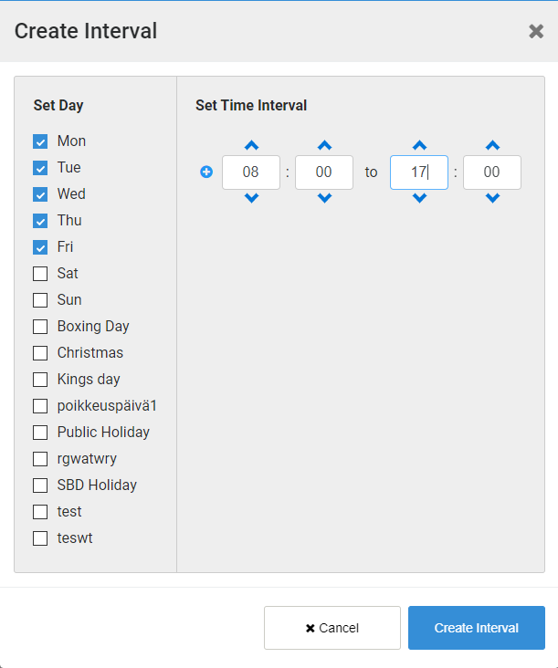 Tick the checkbox next to the day(s) of the week that will have the same set time interval.