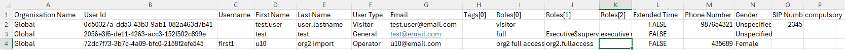 You can export user details from your organizations and their child organizations. The user details are exported to a comma separated values (.csv) file. User details such as user ID, first name, last name, user type, tags associated with the user, roles associated with the user, and contact details are downloaded.