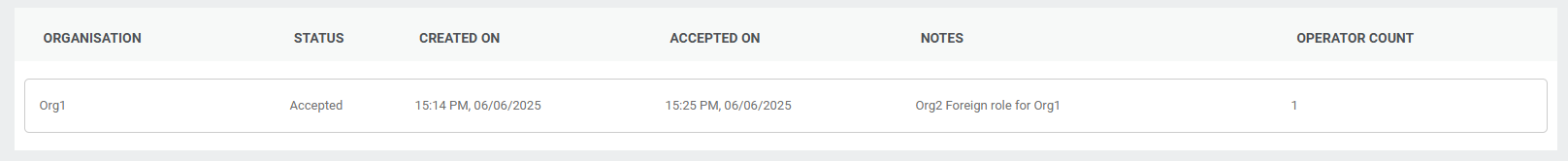 After the foreign operator role is created, you can check the status of the remote grant invite and the number of operators assigned this role in the external organization. Whenever a grant is accepted, the time and date of the acceptance is displayed.