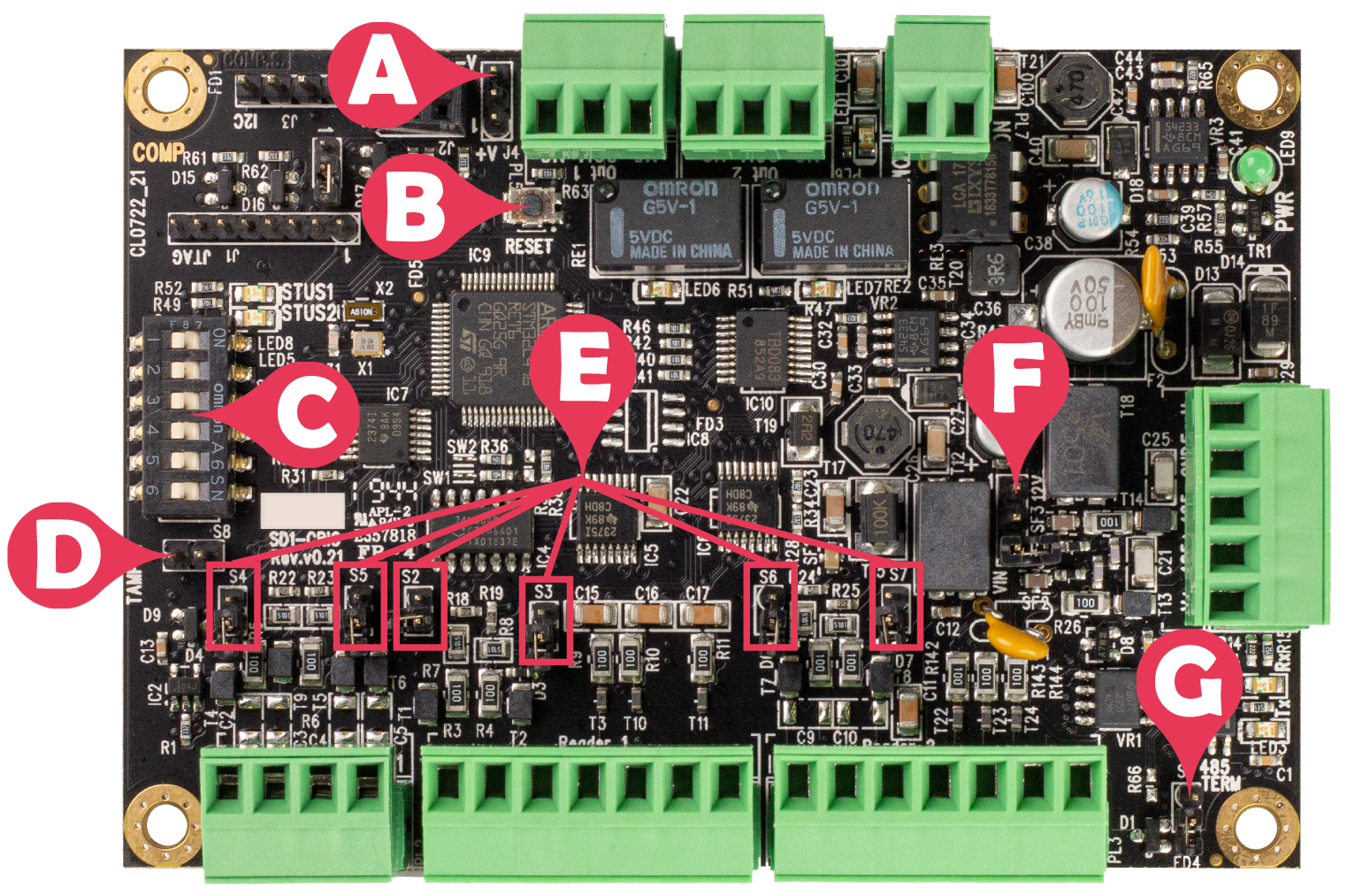 Switch 1 to Switch 4: set the OSDP address on the bus Switch 5 and Switch 6 OFF: no degraded mode Switch 5 ON; Switch 6 OFF: 1 door in degraded mode Switch 5 OFF; Switch 6 ON: 2 doors in degraded mode |