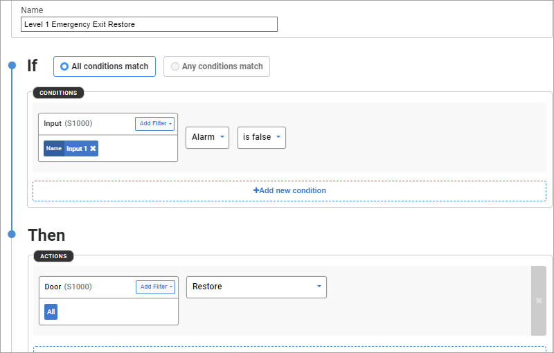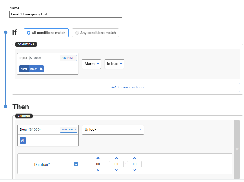 For example, a macro can be configured to unlock all doors when an alarm is triggered. Set the duration to zero to permanently unlock the doors until the alarm is restored.