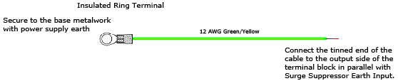 Securely connect the lug to the earth terminal on the base of the enclosure. The tinned end of the cable must be connected to the output side of the Screw Terminal Block in parallel with Surge Suppressor Earth Input.