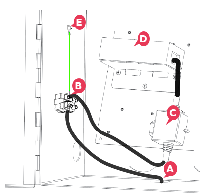Connect the tinned end of the earth harness to the OUTPUT of the terminal block (B) and secure the insulated ring terminal (E) to the earth terminal marked