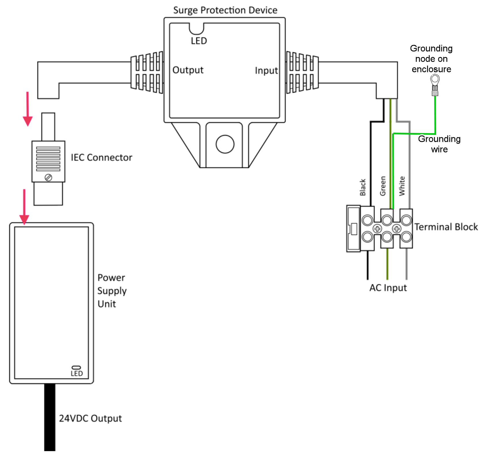 Schematic diagram of how to connect the surge protection device for the power supply unit.