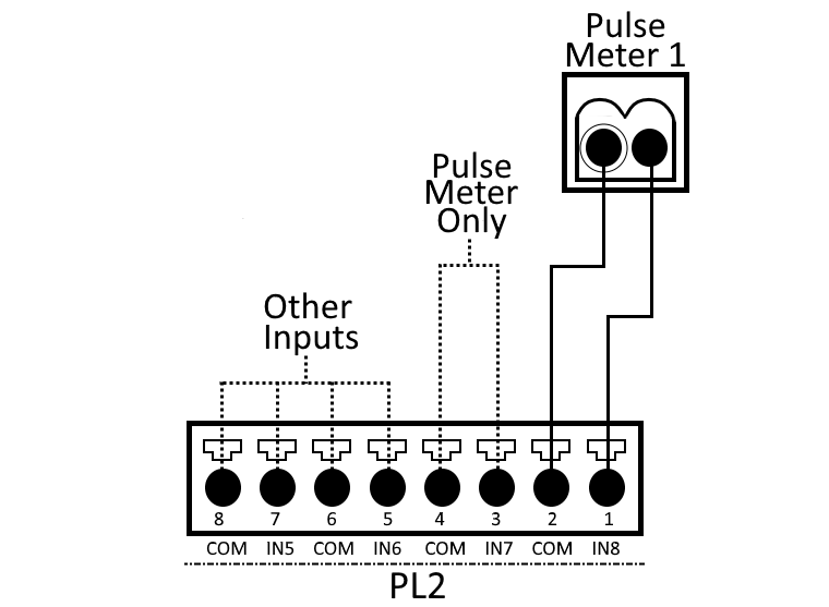 You can receive pulse signals from a third party device (water meter, power meter, etc) to count the number of activations. Use the connection pairs of Inputs 5 and 6 or Inputs 7 and 8 on PL2 for wiring to have a maximum of 4 pulse counters on the S1000 Controller.